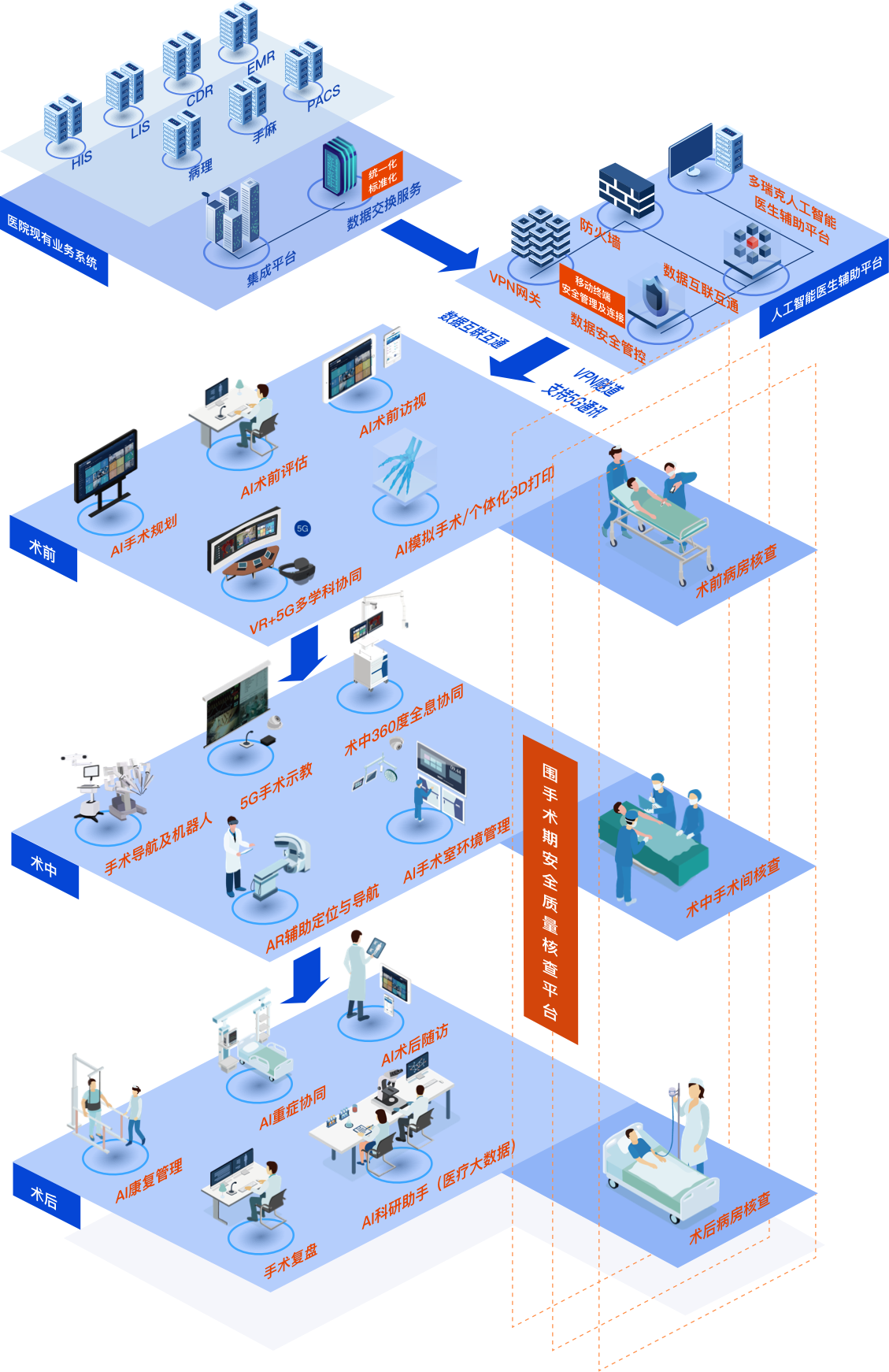 手术团队中的成员, 外科医生、护士和麻醉师按需调用其自己要关注的围手术期功能应用及调阅信息。使术中的每位团队成员均可以实时密切关注与其任务相关的数据。在线实时提供人工智能辅助决策支持。
